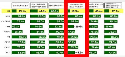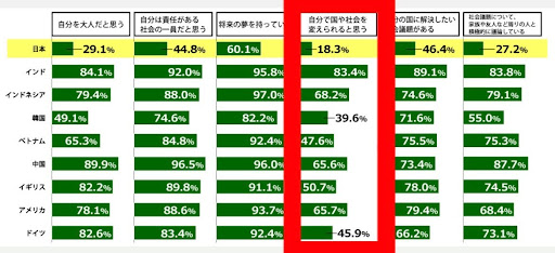- 日本では「自分で国や社会を変えられる」と考える人は5人に1人程度にとどまり、他国と比べても低く、最も低い韓国の半数以下である。この結果から、日本では自分の力で社会に影響を与えられるという実感が弱く、自己肯定感の低さが背景にあると考えられる。自分には価値や力がないと思い込みやすく、その結果、自分の行動に意味を見出せず、さらに自信を失うという悪循環が生まれている。こうした意識が、日本人全体の自己肯定感の低さにつながっているといえる。