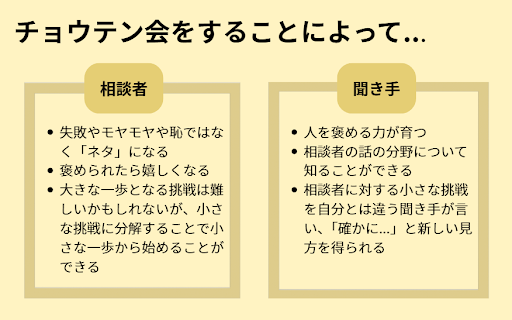- 挑戦できないことの根幹である「失敗が怖い」を払拭できる それだけではなく、右画像のような効果も得られる。相談者だけでなく聞き手にも大きなメリットがあり、win-win!チョウテン会、頂点すぎる!!!