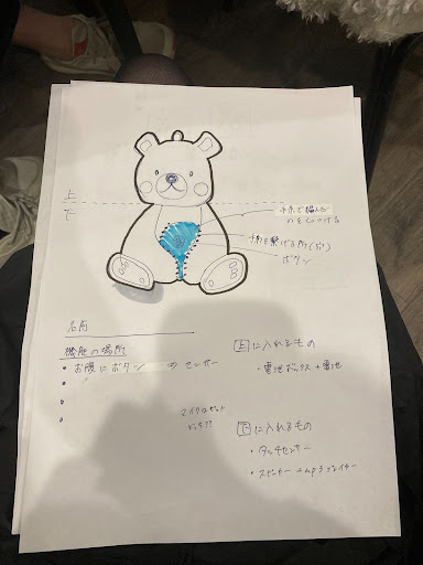 - お腹部分にはタッチセンサーが反応するように布で覆うことになった。その為、当初はお腹に穴を空け、お腹の周りに布を固定する用の糸を通すように穴を付けた。また、頭をとれるようにして頭から機械の取り出しができるようにする予定だった。しかし、頭と胴体部分の接続部分がなかなかうまくいかず、接続できなかった。