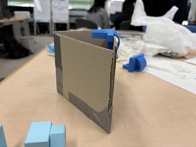 試作2(プロトタイピング)0[最初2枚の写真]半分のサイズ手書きでクリップ部分を制作薄いダンボールを挟むことが可能持ち手なしの袋を結ぶことに成功[最後一枚枚の写真]ダンボールで作った三角コーナー(仮)半分のサイズで作ったものがピッタリ挟むことができた試作30Annotation without title0[上2枚の写真]100%のサイズ(出力するために上下を反転している)ギザギザの部分の入り口をを袋を入れやすくするためハの字に改良Annotation without title0[最終的にできた完成品とほぼ同じのものを使った時のテストの様子]クリップ部分はないが手で押さえてクリップ部分を再現し実際に片手でやってみた。約1分50秒ほどで結ぶことに成功した。結ぶ際は二段階で行い最初に結ぶ形を作りその後クリップで片方を挟み、きつくしてもう一度結ぶことでしっかりとかたく袋を結ぶことができた。Add Annotation Order