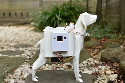 - 変化した時にしか上記の演出ができないため、視認性にこだわった。 首輪に見立てたLEDテープライトとmicrobitのLEDディスプレイの表情を見ただけで状況がわかるようにした。microbitのAボタンを押すことでいつでも数値を確認できるようにしてあるのも、演出がない時にもどれくらいの水をあげればよいかを示すためである。