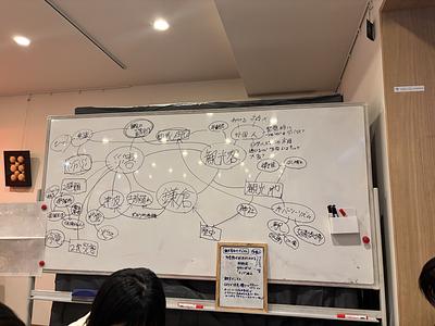 - メンバーが問題だと思う事象をマインドマップに記入し、意見合わせを実施した。結果、観光地である鎌倉に来る外国人観光客は、地震や津波をはじめとした自然災害の危険性を認知していないことが一番の問題であると考察し、外国人観光客に向けた防災対策を進めることにした。