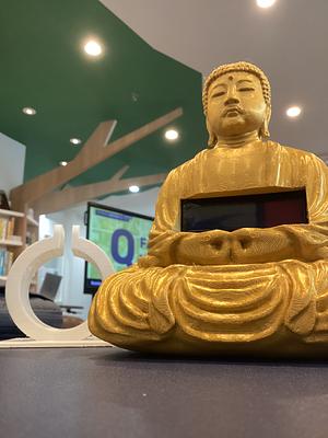 - 鎌倉高校前1号踏切付近での外国人観光客による無断横断への注意の負担を軽減すると同時に、この場所は海に近く、津波などのリスクが高いため、防災ツールとしても活用できるように、その特性を生かしたプロトタイプの作成を行うこととした。 設置場所である鎌倉高校前1号踏切付近の道路は狭く、大型の物は設置できないことから、標識ポールに取り付けられる形状とした。また、鎌倉を訪れる観光客もターゲットであるため、視覚的にわかりやすく親しみやすい鎌倉大仏の形にデザインした。