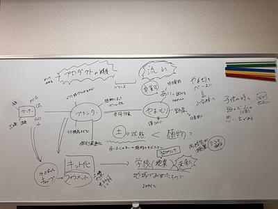 - 子供が自然から離れている原因として、メンバーの実体験を意見交換し、”自然と触れ合える場所を知らない”ことと”放課後の時間の使い方が変化している”ことを仮説とした。