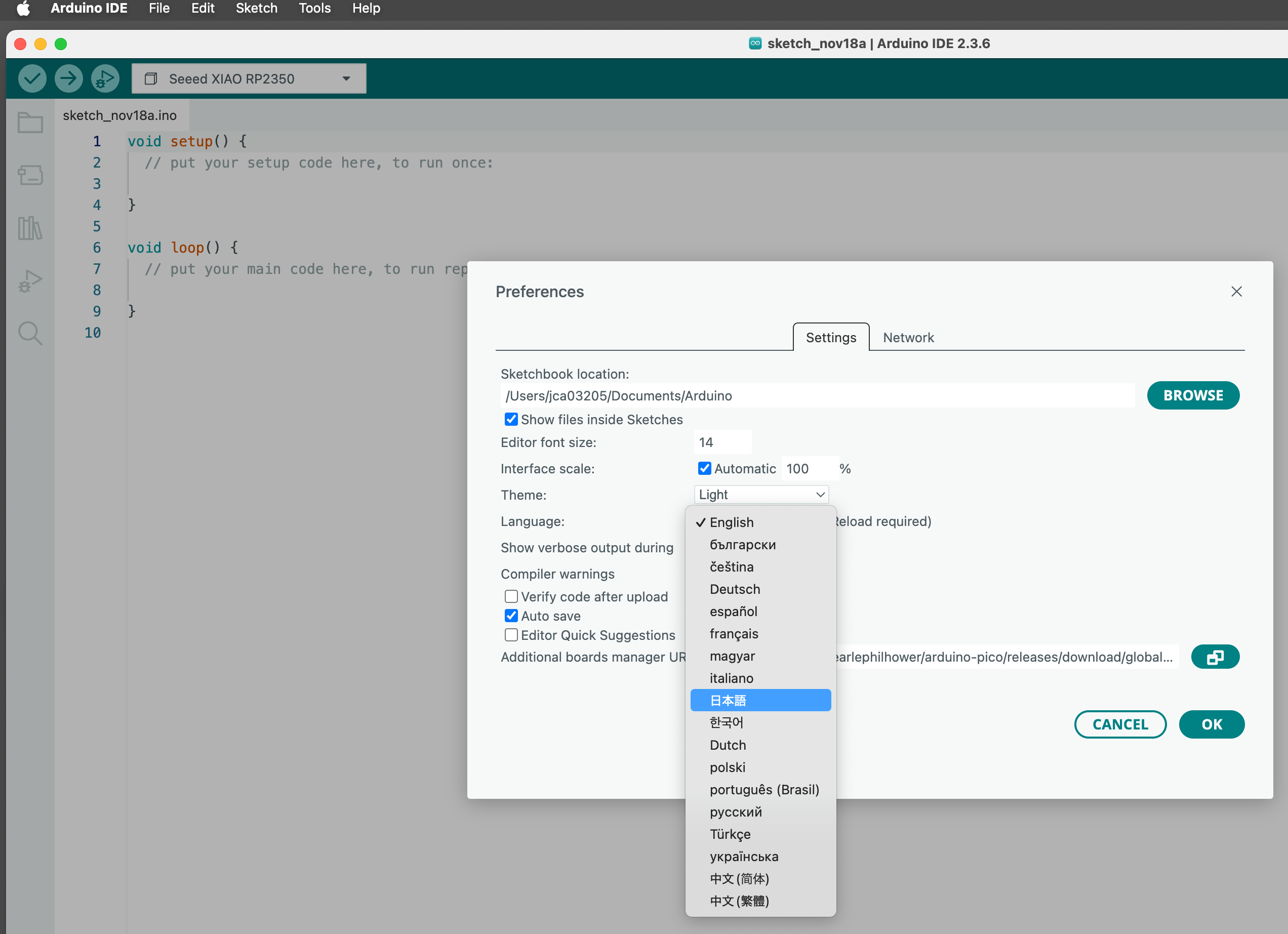 - Arduino IDEを立ち上げて、上の Arduino IDE メニューより 「Preferences...」を選びます。Preferencesのウインドウが中央に現れるので、まずは言語を日本語に変えましょう。