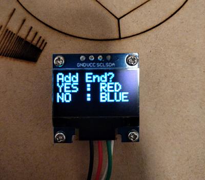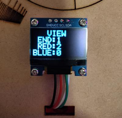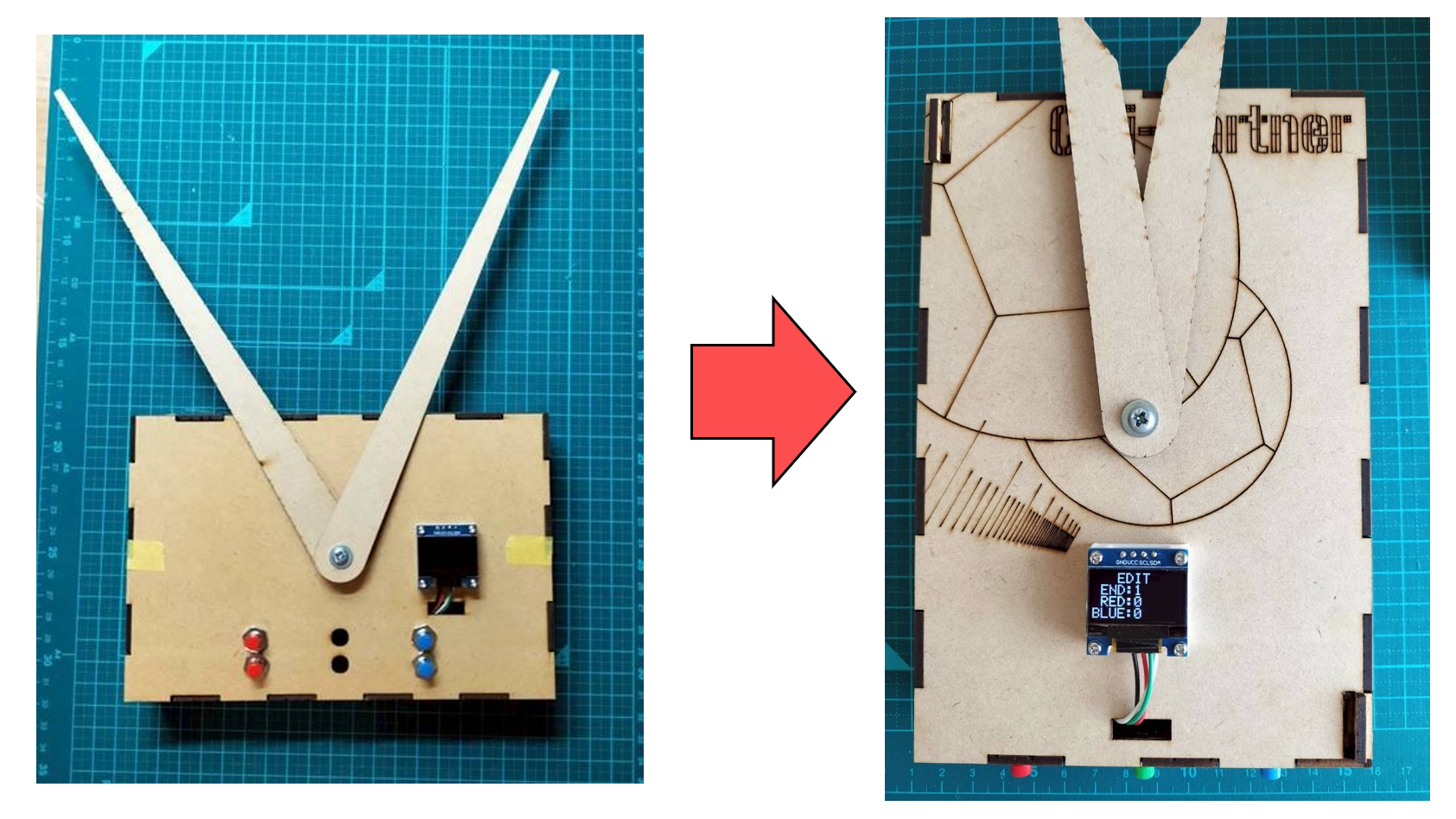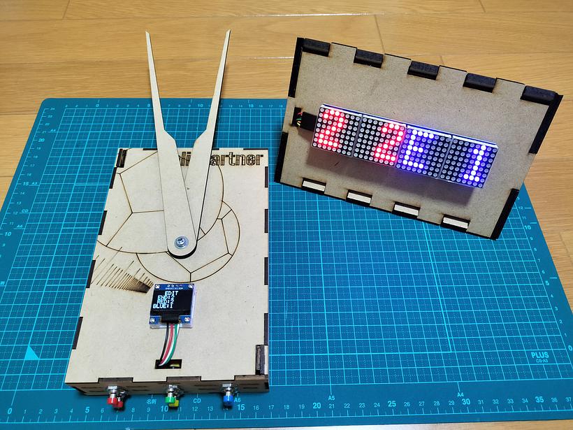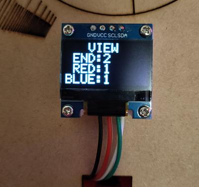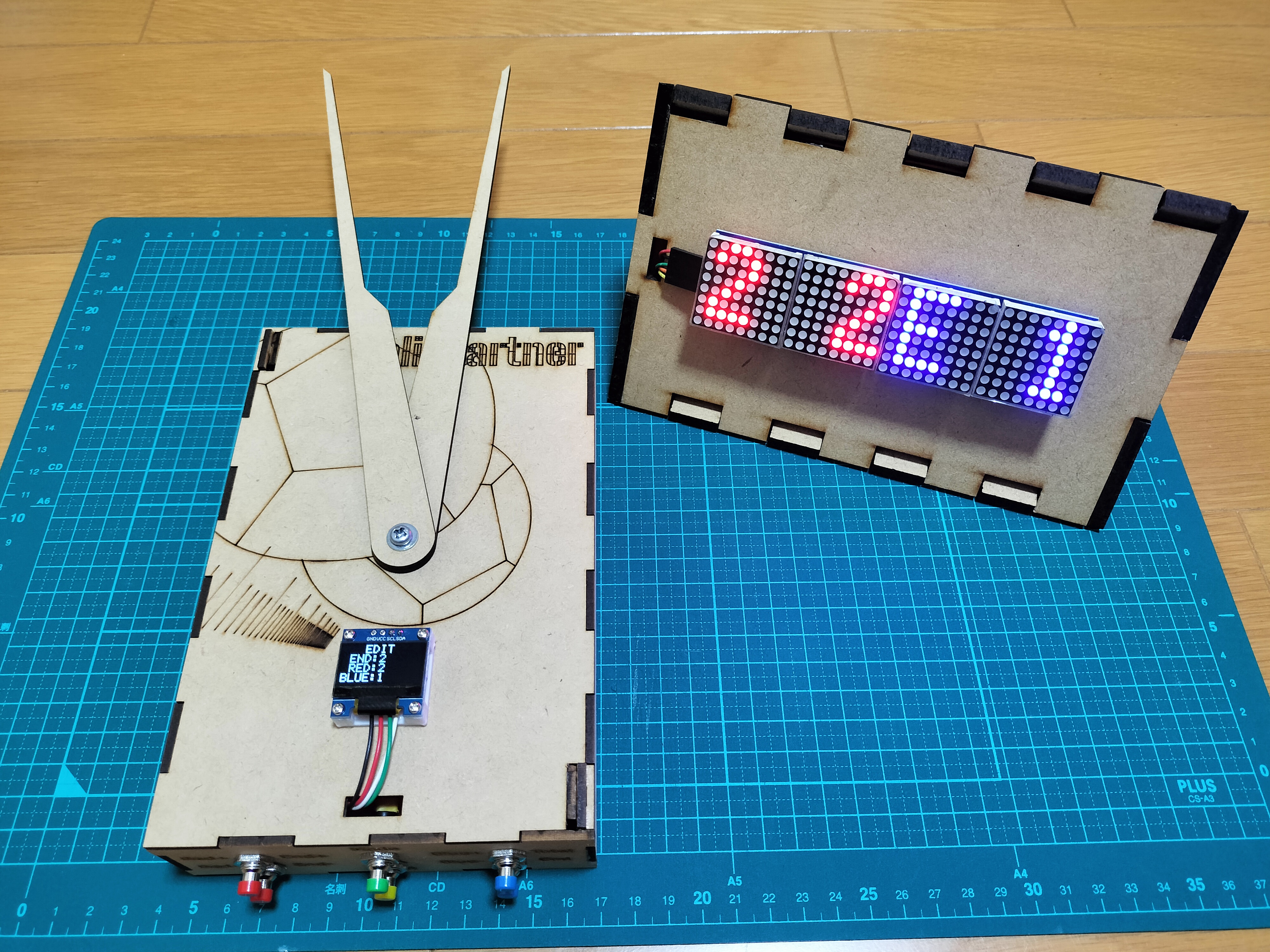 - ボッチャのルールでは、1エンドの最高スコアは6点です。それに合わせて、1stプロトタイプでは、1エンド分のみを想定して制作したのでスコアが0〜6の時に対応したプロトタイプを製作しました。しかし、最大9エンドまで試合ができる機能を追加したことにより、スコアが2桁になる可能性に考慮する必要が出てきました。1stプロトタイプのプログラムでは点数版に2桁表示させることは難しかったため、スコアが0~9の時と、10以上の時で場合分けされるプログラムに改良しました。写真は24対11(5エンド)を表示しています。