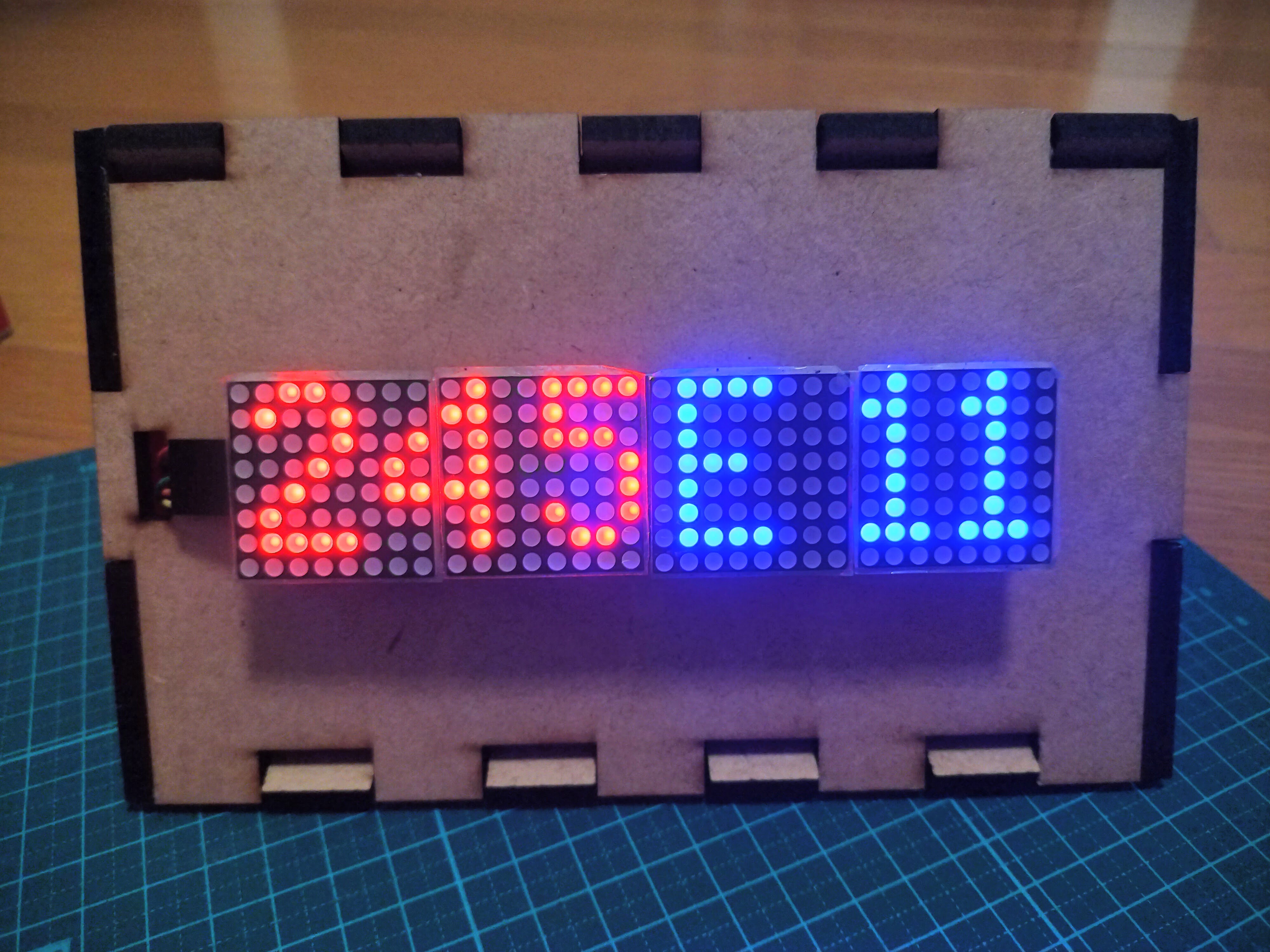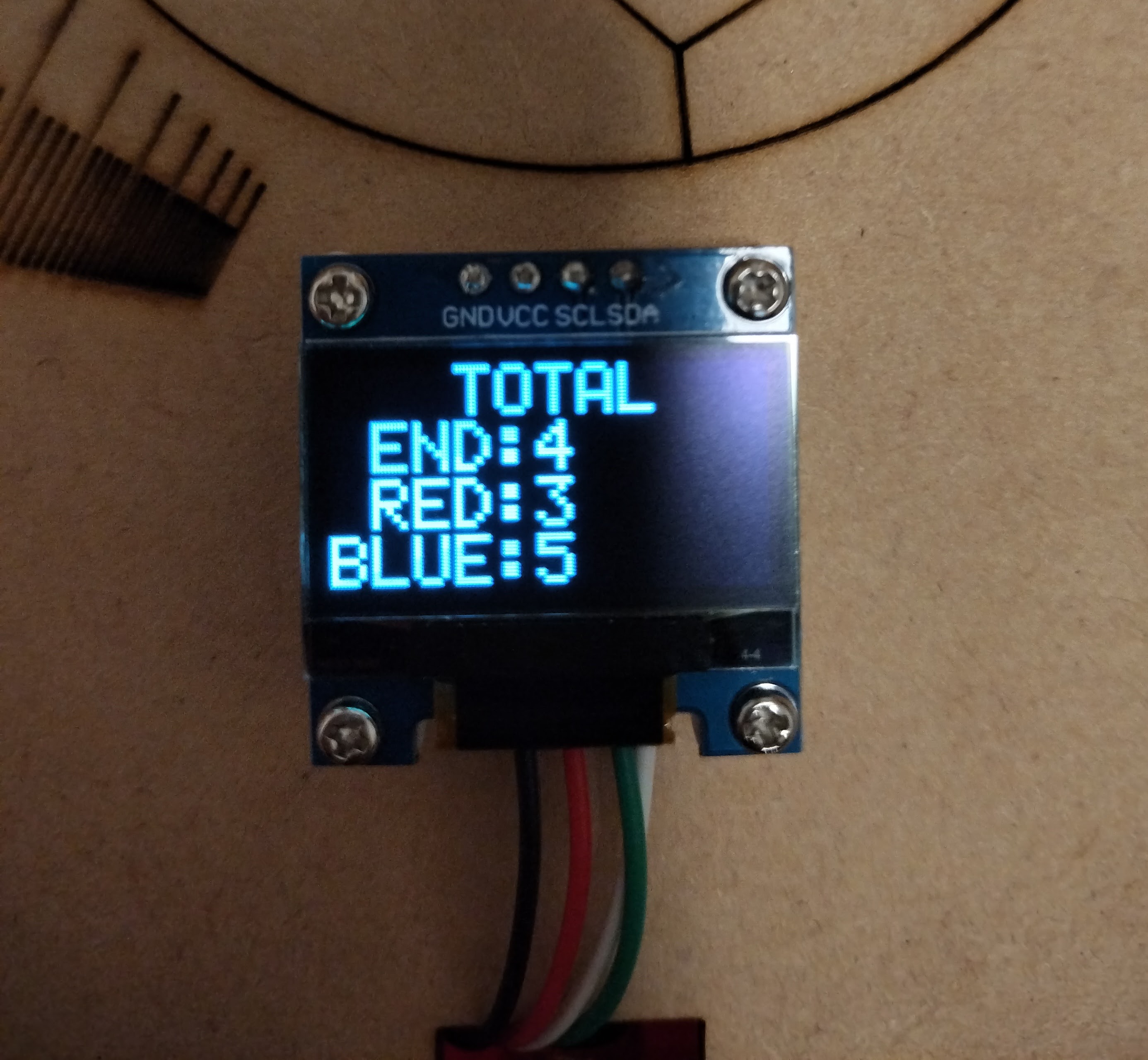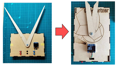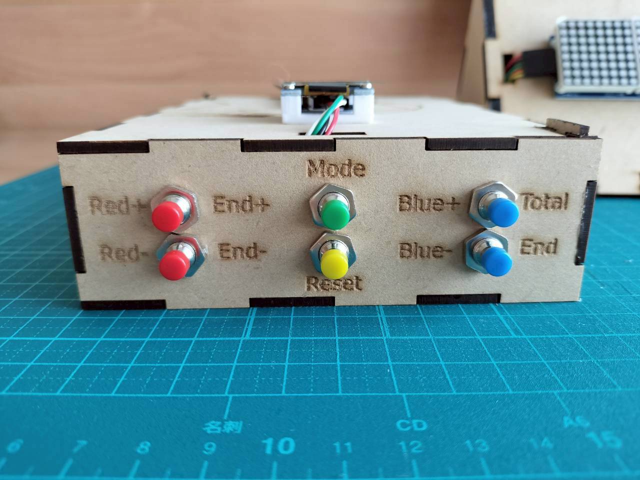 - ボッチャのルールでは、1エンドの最高スコアは6点です。それに合わせて、1stプロトタイプでは、1エンド分のみを想定して制作したのでスコアが0〜6の時に対応したプロトタイプを製作しました。しかし、最大9エンドまで試合ができる機能を追加したことにより、スコアが2桁になる可能性に考慮する必要が出てきました。1stプロトタイプのプログラムでは点数版に2桁表示させることは難しかったため、スコアが0~9の時と、10以上の時で場合分けされるプログラムに改良しました。写真は24対11(5エンド)を表示しています。