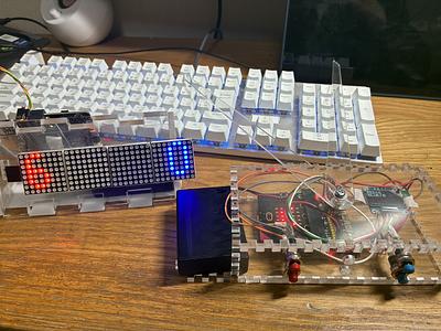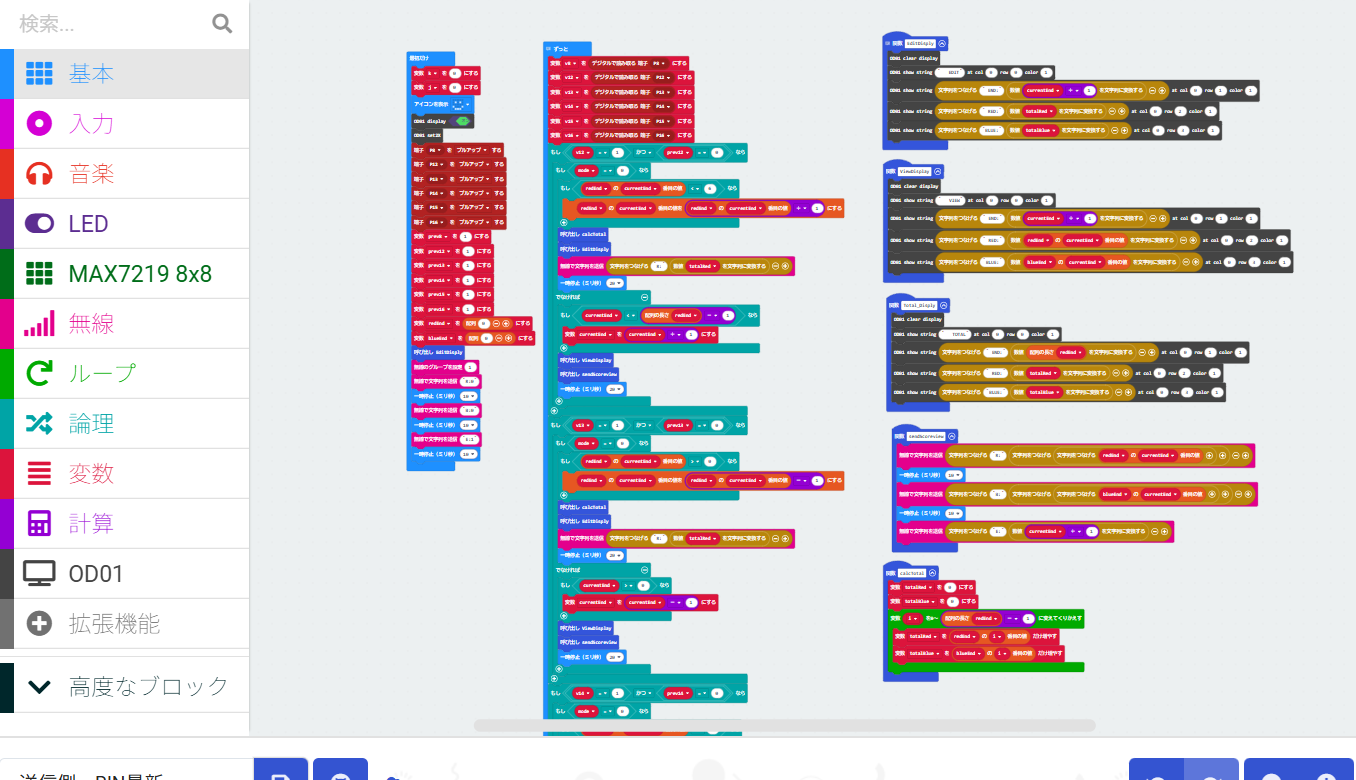 - micro:bit2つを点数の記録と受送信、OLEDをキャリパー側の点数表示、7セグを得点版に使いました。ボタンを押されると、キャリパー側のmicro:bitが点数の記録と送信を行い、得点版側のmicro:bitが受信と点数表示を行います。makecodeを使って、プログラムを構築しました。