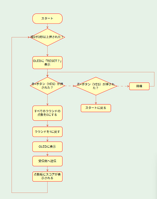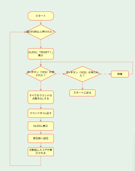 - リセットボタンを新たに作り、ゲーム終了後、リセットボタンを押すことで新しいゲームを始められるようにしました。誤操作を防ぐために、2秒以上長押しすることでリセットされるようにしました。