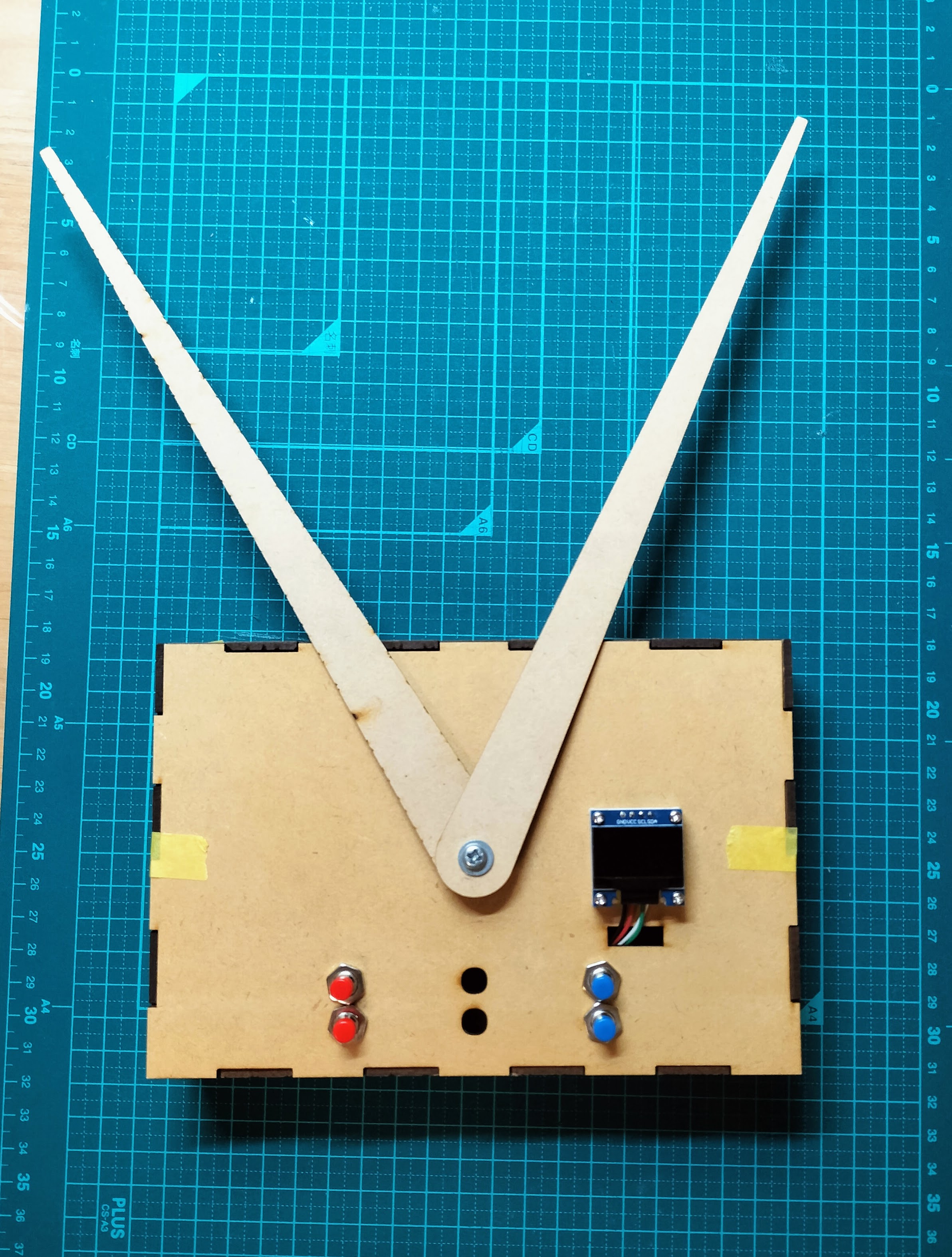 - 最初の設計では、キャリパーを収納・操作する箱を横長の形状で考えていました。しかし実際の使用状況を想定すると、「測る → 移動 → 測る」という動作を繰り返す必要があり、そのたびに横に長い箱を持ち運ぶのは扱いづらく、動作の効率を下げてしまうことが分かりました。特に審判はスムーズな進行が求められるため、この点は大きな課題となりました。