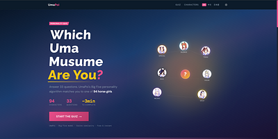 UmapoiUmaPoi is a free personality quiz inspired by Uma Musume Pretty Derby. Answer 33 questions rooted in Big Five personality science, and UmaPoi matches you with the horse girl who shares your traits — out of all 141 characters. Each result comes with a detailed personality breakdown, match percentage, and stat radar showing your Speed, Stamina, Power, Guts, and Wisdom. UmaPoi also features a full character database where you can browse, filter, and explore every Uma Musume character's personality profile. Share your result with friends via a beautifully generated social card. Available in English, Chinese, and Japanese.